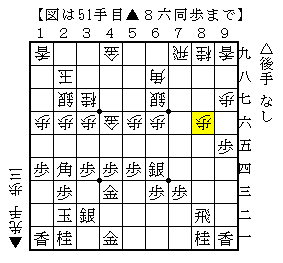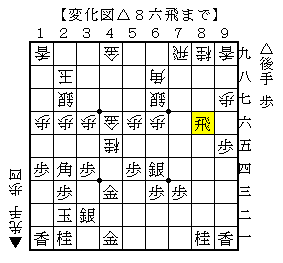 △4五歩▲同桂△8六飛で、ソフトの評価値-817で後手優勢。