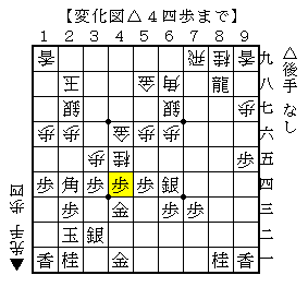 △4四歩以下▲2五歩△3五角▲同金△同歩▲3三歩△同桂▲同桂成△同銀▲3七歩△3二金で、ソフトの評価値-878で後手優勢。