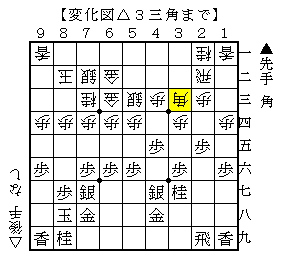 △3三角以下▲3五歩△同歩▲4四歩△同角▲4五桂△4二銀▲5七金△8五桂▲8六銀△6五歩▲4六銀△6六歩▲5五歩で、ソフトの評価値+45で互角。