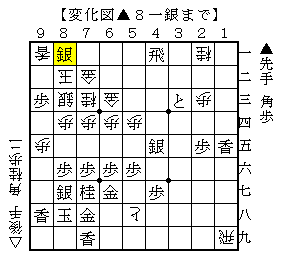 実戦は▲9五歩△同歩▲9二歩△同銀▲9三歩△8三銀に変化手順で▲8一銀で、ソフトの評価値+1238で先手優勢。