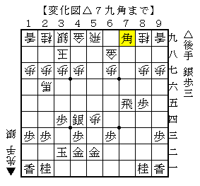 △7九角に▲7七銀なら△6八角成▲同銀△7八飛成▲7七角△7六歩で、ソフトの評価値-962で後手優勢。