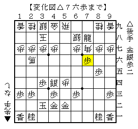 △7六歩以下▲4四角△6八龍▲5八金△5九龍▲同金△4四歩▲同馬で、ソフトの評価値-1366で後手優勢。