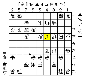 ▲4四角に△3三歩なら▲3五銀△同銀▲同角△2二飛▲2六飛△2五歩▲4六飛△4三歩▲7七桂で、ソフトの評価値+324で先手有利。