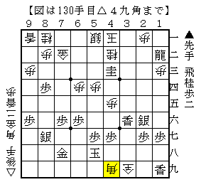 上図は、横歩取りからの進展で△3九成銀と角を取った局面。ソフトの評価値+99973で先手勝勢。