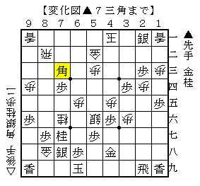 ▲6八歩△8八金▲6九玉△5六銀▲7三角で、ソフトの評価値+517で先手有利。