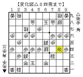 この手順は△8四飛の瞬間が後手は歩切れで、先手に指したい手がいくつかあるので後手としては少し怖い形です。