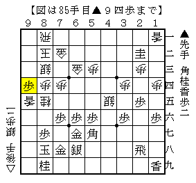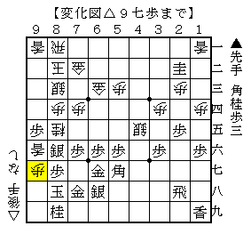 実戦は△7七歩成以下▲同玉△6九角成▲5三角成に変化手順で△4一玉で、ソフトの評価値+263で互角。