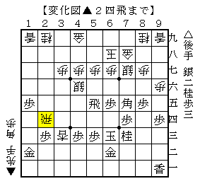 △2四歩以下▲5四歩△2五飛▲3六角△4五桂で、ソフトの評価値-301で後手有利。