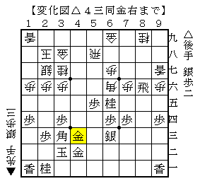 △4三同金右に▲8八歩なら△4六歩▲4四歩△同金▲4五銀△5四銀打▲4四銀△同角で、ソフトの評価値-625で後手有利。