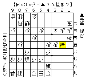 △4六銀以下▲3二桂成なら△同玉▲3八銀△6四桂で、ソフトの評価値-1226で後手優勢。