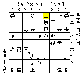 △4一玉以下▲5九金△3九飛▲3七桂で、ソフトの評価値+83で互角。