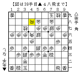 ▲4八飛には△4二銀や△6五桂も有力だったようですが、自分が△4二銀ときめ細かく指す棋風でないのでちょっと調べていないと指せないかもしれません。