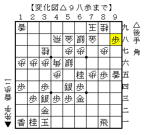 △9八歩以下▲8八玉△8六歩▲同歩△同飛▲8七歩△9六飛▲9七香△7六飛で、ソフトの評価値-676で後手有利。