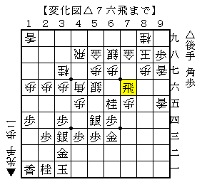 実戦は▲4八飛に△7五歩で、以下▲同歩△6五桂▲6八銀△9五歩▲同歩△8六歩▲同歩△同飛▲8七歩△7六飛で、ソフトの評価値+108で互角。