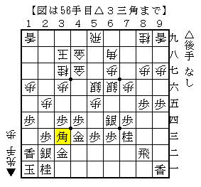 この△3三角と上がった局面は互角にはなってますが、先手が少しずついい形になっているので後手としてはさっぱりです。