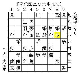 △8六歩に▲同歩△5四歩▲5八飛△5五歩▲同銀左△6五桂▲同銀△同銀▲4四銀△同金▲同角△8六飛▲8八歩△5七歩で、ソフトの評価値-813で後手優勢。