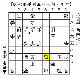 この手順は▲5九飛の受けには△7六馬が少し見えづらく▲8一飛成でお手伝いかと思ったのですが、△3五桂と打つ手がありました。