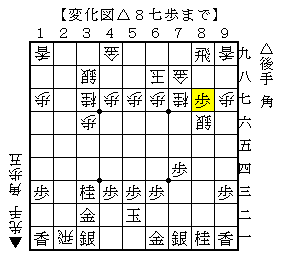 上図は、先後逆で横歩取り勇気流からの進展で▲9六同歩と香車を取った局面。ソフトの評価値-27で互角。