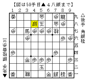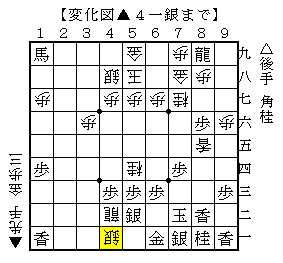 ▲4八銀以下△1九馬▲3三龍△6二玉▲8五香△8二香▲4二龍△5二銀▲5四桂△7二玉▲4一銀で、ソフトの評価値+1733で先手優勢。