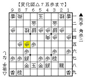 先手は龍が浮いている形なので△4四角と狙われやすく▲2八龍に△7五歩とさらに歩を突き捨てて攻める形です。