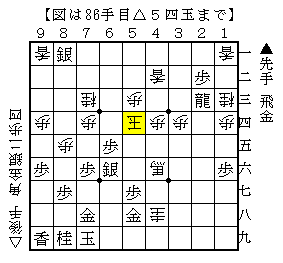 次の局面図は実戦から▲6五歩と打った手に△6四の玉が△5四玉とした局面。ソフトの評価値+99989で先手勝勢。