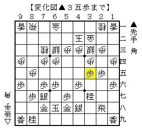 本局の▲3五歩の仕掛けは、後手玉が居玉で△5二金△8一飛型です。