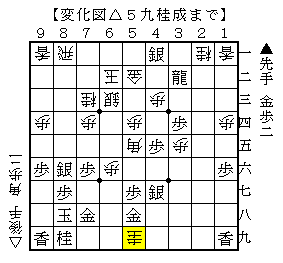 △5九桂成以下▲5二銀成△同銀▲7二金△同玉▲5二龍△6二銀▲6三銀△8三玉▲6二龍△6七歩成▲9八玉で、ソフトの評価値+5000で先手勝勢。