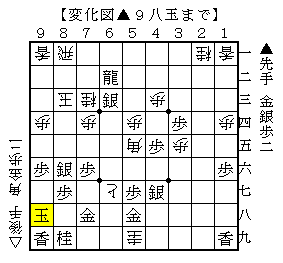 ▲9八玉に△9三玉として▲7四銀成に△8八金としても▲9七玉で先手玉は詰みませんが、△8七金▲同金△8八角打から王手で追い回す手があって少し怖い形でした。