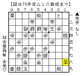 以下▲9一飛成に△1八香成ともたれる指し方で、▲2五飛に△1三歩で先手も攻め駒が少なく互角のようです。