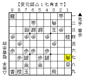 ▲4一飛△1八香成▲3九飛△3二角▲9一飛成△1七角で、ソフトの評価値+498で先手有利。