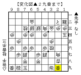 ▲2九香に△2八桂成なら▲同香△同成香▲3五飛△3四歩▲5五飛△5四香▲2五桂△5五香▲3三桂成△2五玉▲4三成桂△2六玉▲1三龍で、ソフトの評価値+1168で先手優勢。
