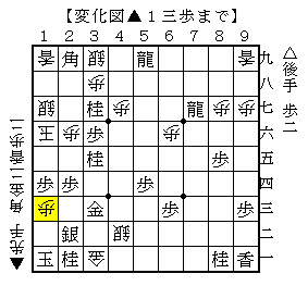 これは▲4二銀が詰めろだと読んで受けた手ですが、▲1三歩がありました。