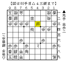 実戦は▲5二銀△4七歩成▲5四飛△5二金▲同成桂△4三銀で、ソフトの評価値-44で互角。