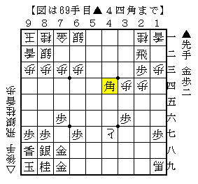 ▲4四角に△5二飛なら▲同金△5一歩▲4一飛△5二歩▲7一角成△同銀▲同飛成△8二銀▲2一龍△7一金▲同龍△同銀▲6一金△2一飛▲7一金△同飛▲6二金で、ソフトの評価値+962で先手優勢。