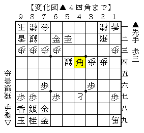 ▲4四角の時点の駒割りは金と銀桂香の交換になっており、実質先手の駒損です。