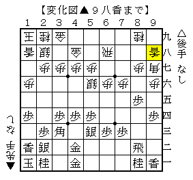 実戦は△4四歩だったのですが、以下変化手順で▲9六歩△8五歩▲9七角△4二金寄▲9八香で、ソフトの評価値-130で互角。