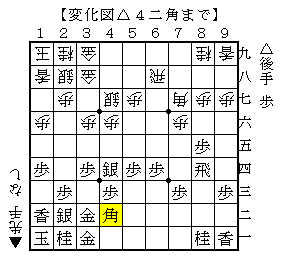 △4二角の局面は互角ですが、これらの後手の指し手を見ますと大駒を細かく動かしているようです。