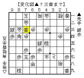 ▲8四同角以下変化手順で△8三金打▲9三銀△7一玉▲7三香で、ソフトの評価値-2079で後手勝勢。