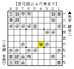 先手の7七の角が▲6六角とした形で、次に▲4五歩の狙いです。