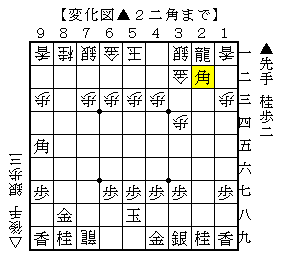 ▲9五角△7六飛▲8八金△7九飛成▲2二角で、ソフトの評価値+628で先手有利。