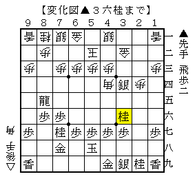 ▲3四銀に△4四角と出たのは▲2三歩の先受けですが、そこで▲3六桂がありました。