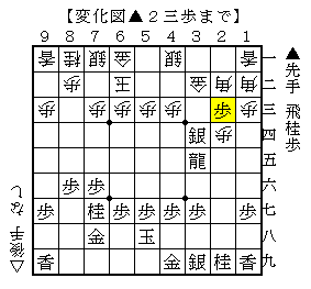 この手順は▲2三歩からがりがり攻める手ですが、△3三角に▲同龍が少し決断のいる手です。