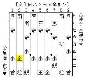 △2三同金に▲8二飛成なら△8三銀打▲4八玉△9二金で、ソフトの評価値-171で互角。