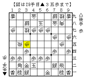△3五歩と打っても8五の飛車が縦に移動すると▲3五飛と歩を取られるので、後手としては△3五歩と打った手が負担になっているようです。