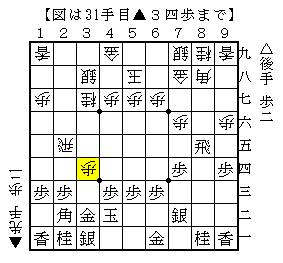 3四の歩が後手玉に近い形で、この歩を拠点に攻められると後手はまずそうです。