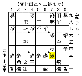 △7三銀とすることで後手の飛車の横の利きが通るのと、飛車のコビンを閉めたので少し受けやすい形になります。