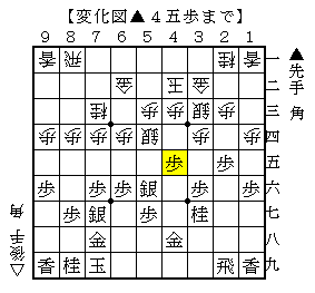 ▲4五歩は将来の△4四角を防いだ手ですが、先手から▲4五桂と仕掛ける手がなくなり、先手からの仕掛けが難しくなるので一長一短です。