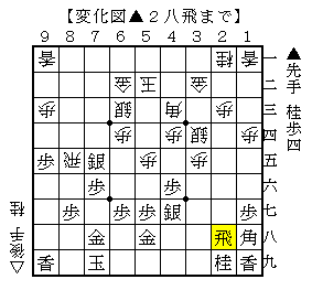 ▲2八飛以下△7六角▲8六銀△8二飛▲7七歩△4三角▲4五歩で、ソフトの評価値+517で先手有利。