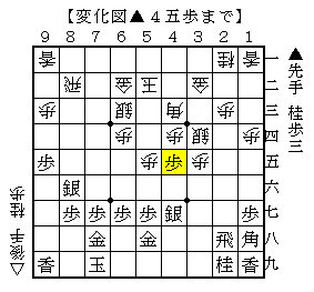 ▲4五歩に△5三金なら▲4四歩△同金▲4五歩△同銀▲3七桂で、ソフトの評価値+750で先手有利。