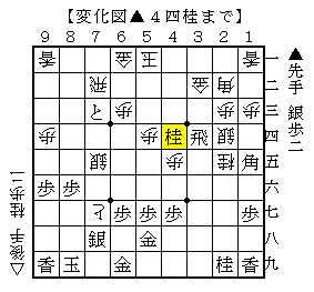 それに対してどうやって受けるのかと思っていましたが、▲4四桂が詰めろ逃れの攻める手でした。